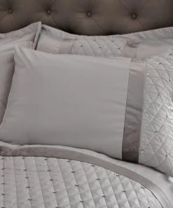 Amaze with this glamorous statement collection designed and developed in Great Britain by Catherine Lansfield, renowned for style and quality. Featuring a quilted satin border in duck egg with sequin embellishment, this filled bedspread adds layering whilst creates both a dazzling and elegant bedroom look. Made from a smooth polyester satin front and soft peach skin reverse. Complete the 5-piece bedding collection with the duvet cover set, boudoir cushion, pillowsham, curtains and bedspread.