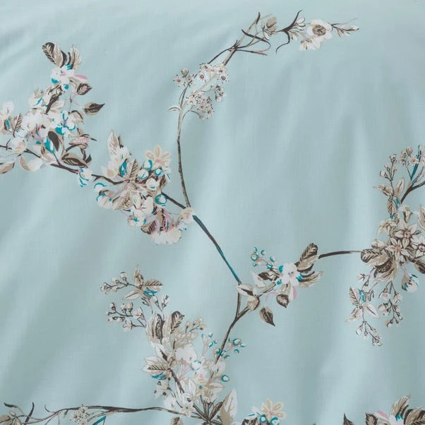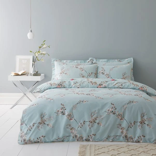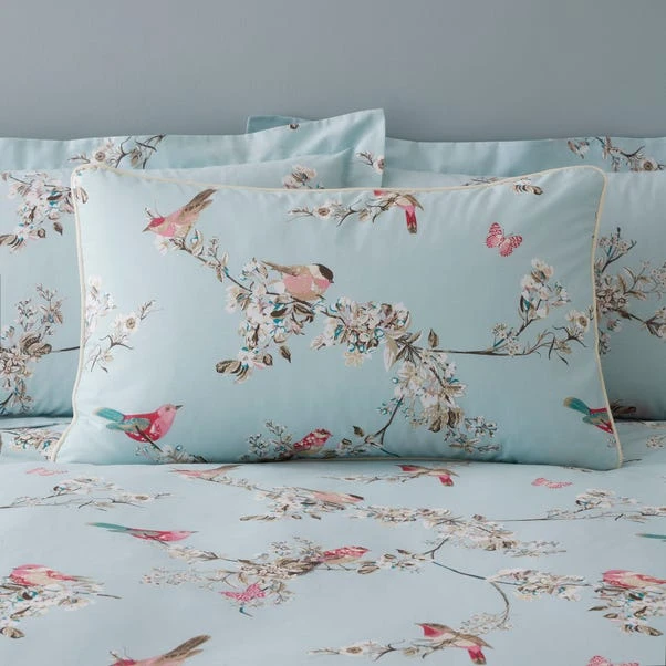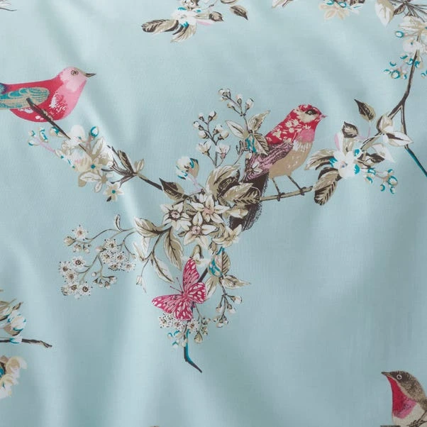 Featuring a bird and floral printed design in pink and white with piped edging, this duck-egg blue duvet cover set is crafted from soft machine washable polycotton. Pillowcase(s) included.