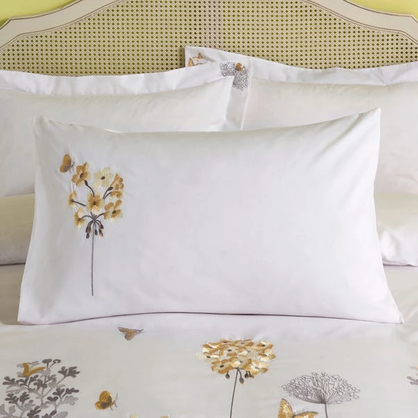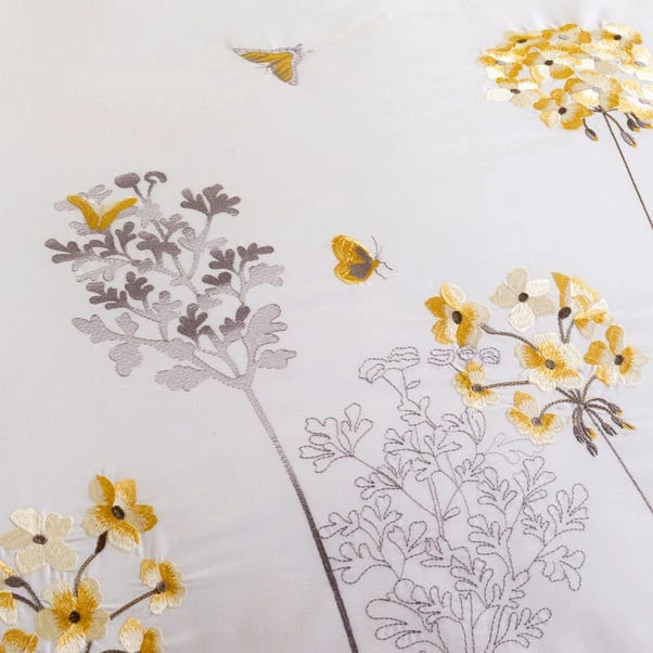 Decorated with delicately detailed embroidered ochre flowers on a fresh white backing, this stunning duvet cover set is perfect for adding a subtle touch of nature to your home. This duvet cover set comes complete with pillowcase(s) and is crafted from a cotton blend or polycotton for improved comfort and durability. Machine washable for convenient care and available in multiple sizes with matching items available to purchase separately.