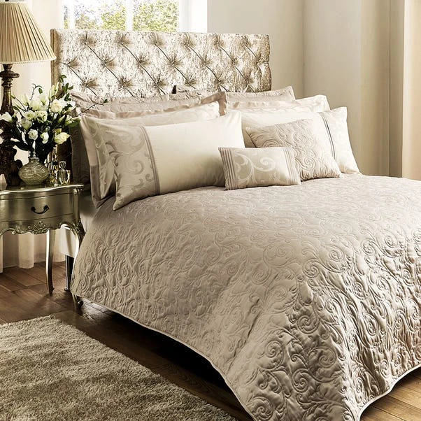 Featuring a damask style jacquard pattern in natural colours with gold edging, this bedspread is available in a choice of sizes.