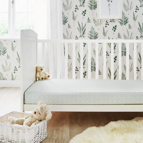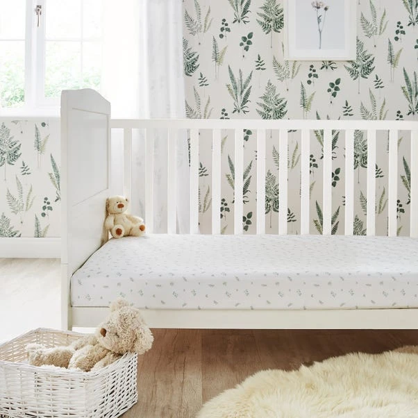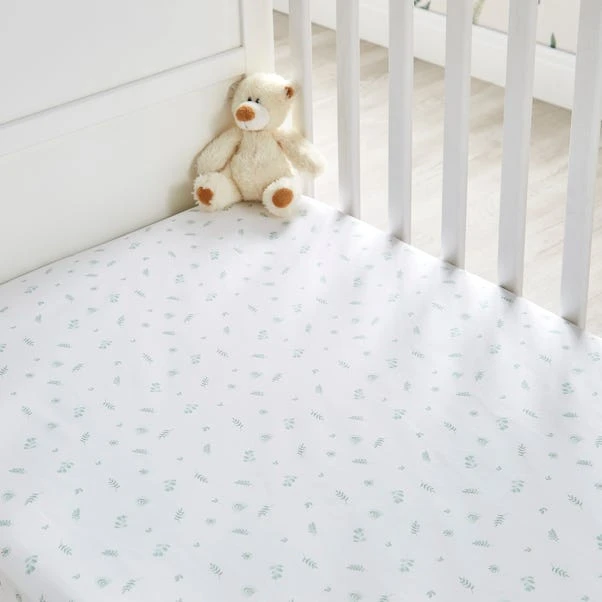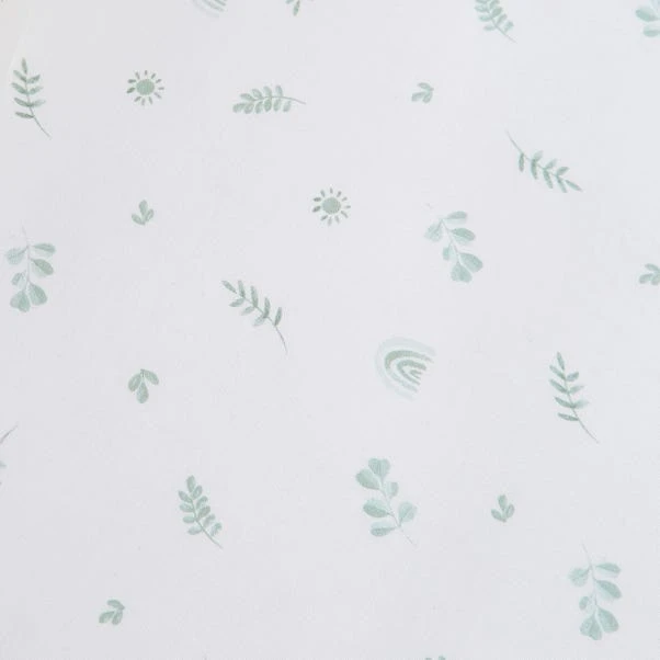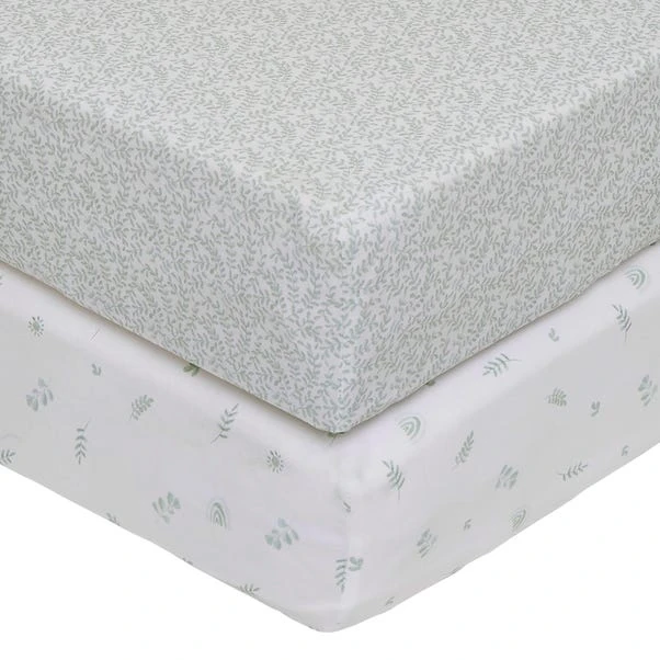 Help your little one lay in comfort on this super soft, 100% cotton jersey fitted sheets. One sheet features green eucalyptus leaves and a rainbow printed design on a white background. The second fitted sheet is green all over with beautiful eucalyptus leaves.
