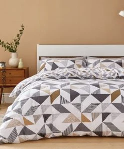 From our elements collection, this duvet cover and pillowcase set features a silver and gold geometric design on a subtle neutral colourway. Accompanying a larger print on the face and smaller on the reverse, for a quick bedroom style change. Crafted from a soft, durable polycotton blend, this duvet cover and pillowcase set is easy to care for at home and comes in a range of sizes.