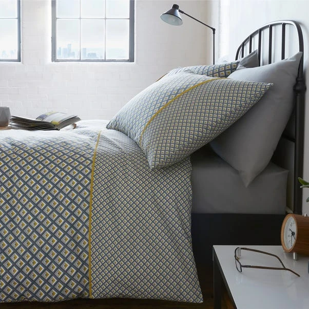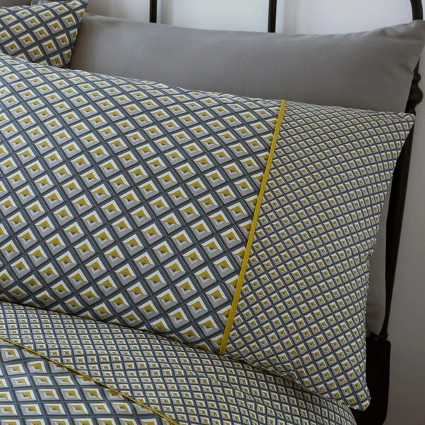 A stylish, ultra-modern geometric diamond-shaped bedding design with contrasting ochre yellow piping. A complimentary smaller diamond pattern is featured on the border and reverse of the bedding for additional flair. Contemporary colours of grey and ochre yellow hues match with today’s recent bedroom trends. This duvet cover set is machine washable for easy care and comes with coordinating pillowcase(s).